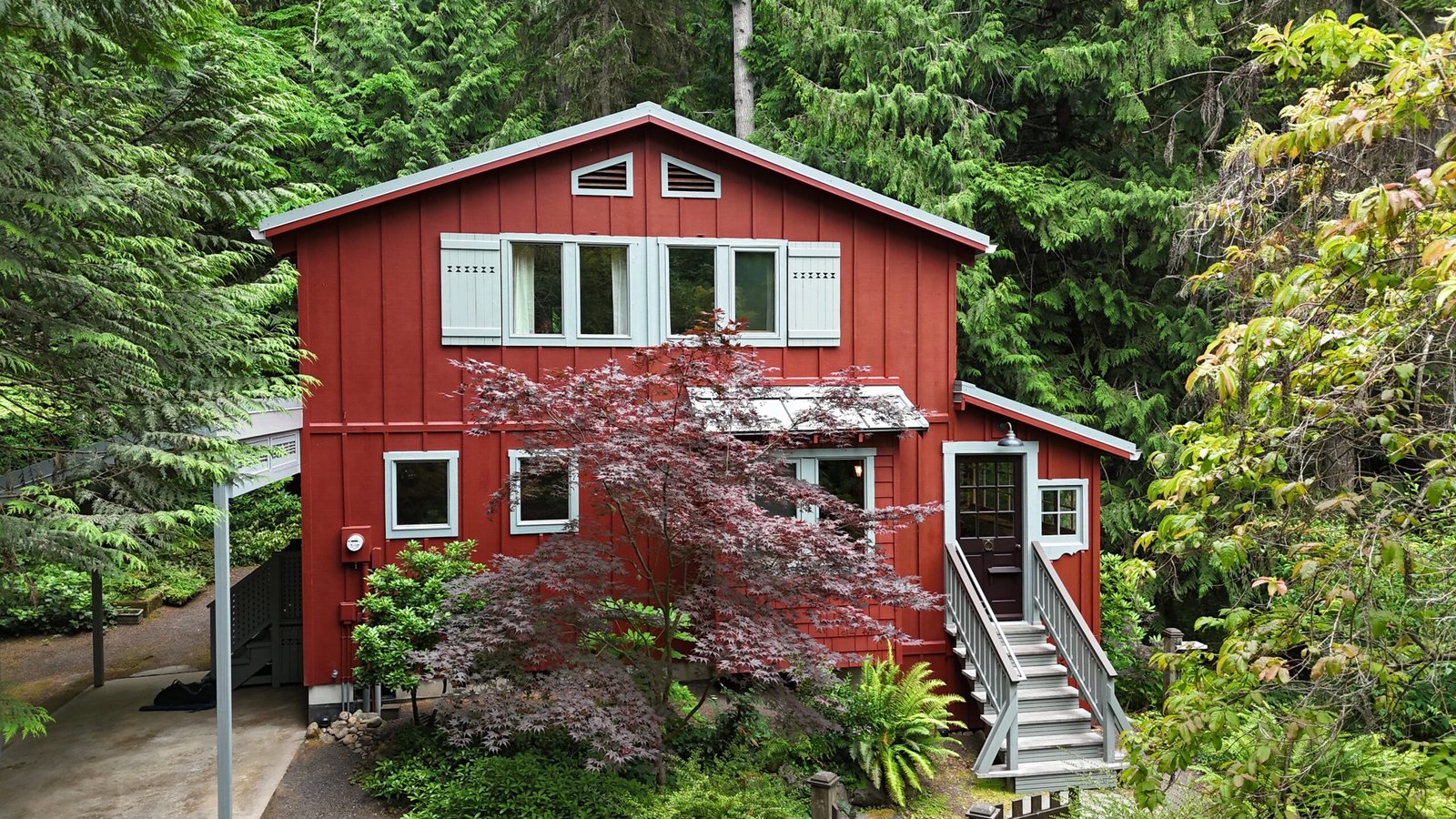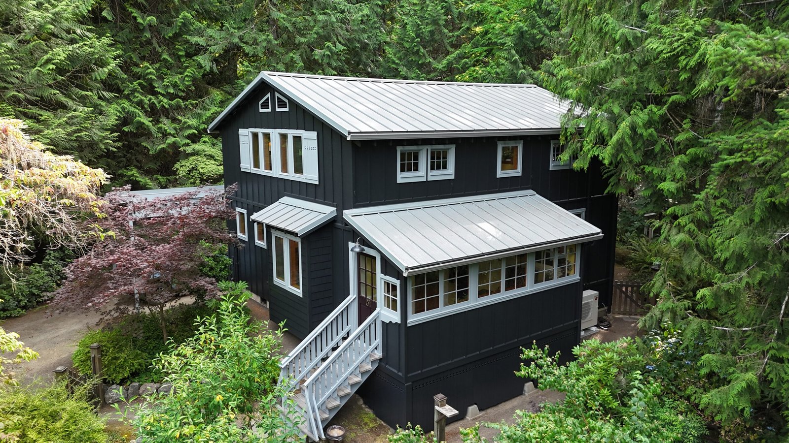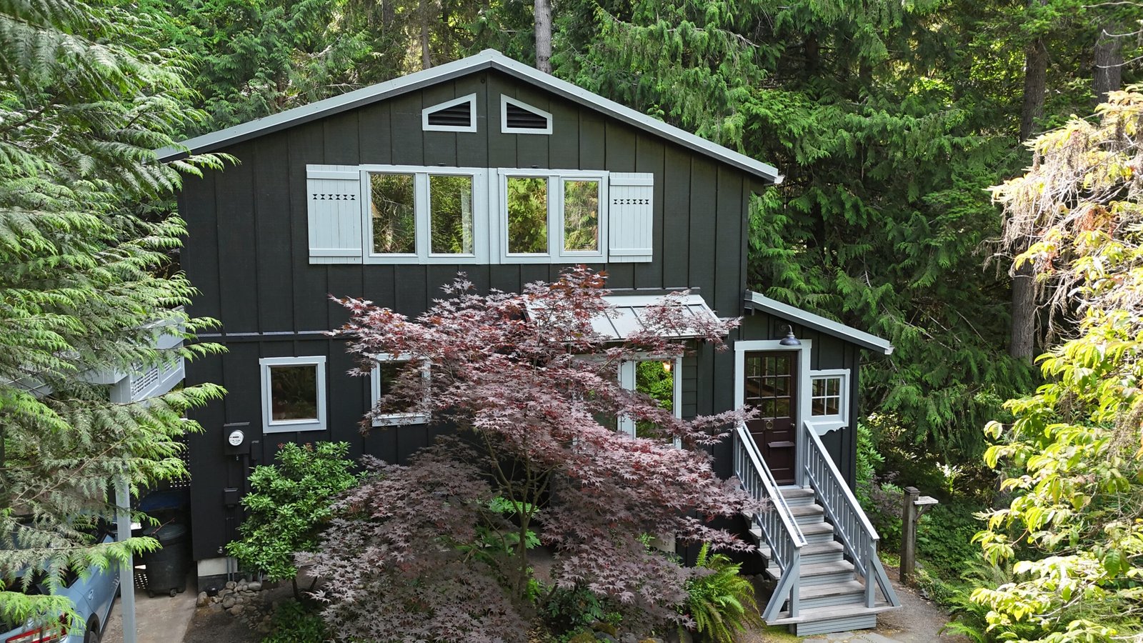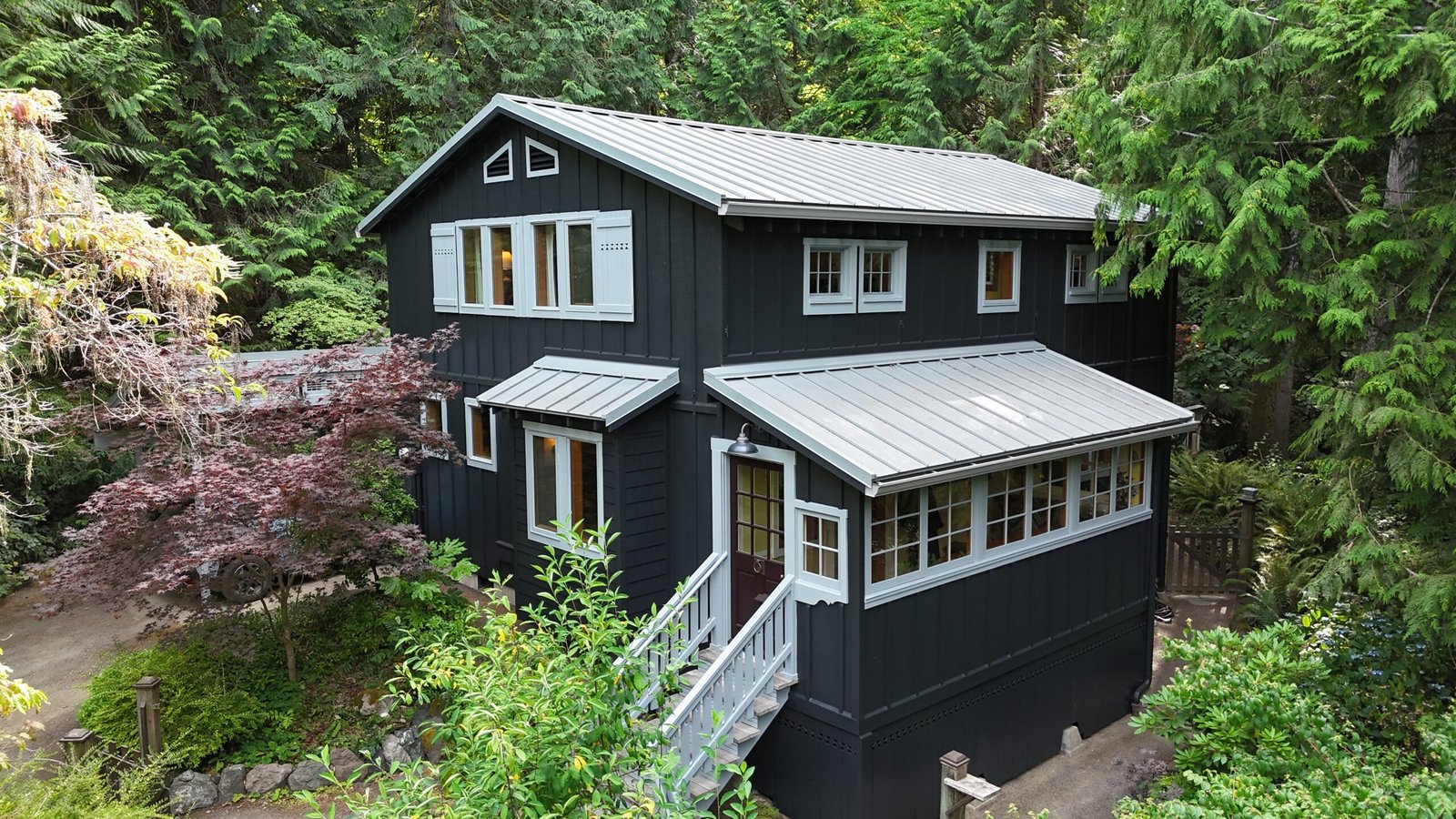 This Bainbridge Island home received a dramatic exterior transformation with a full repaint of both the main house and its separate shed-style building. The original barn-red body with white trim was updated to a striking pure black exterior paired with light gray trim, creating a clean, modern look that blends beautifully with the surrounding Pacific Northwest landscape. The new color scheme modernizes the entire property and gives it a bold, timeless presence. This was a truly beautiful project, and the deep black finish delivers a contemporary style that’s here to stay.