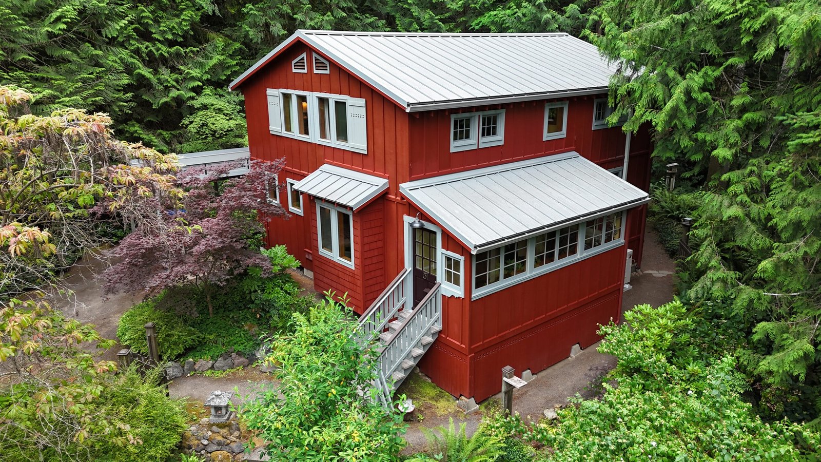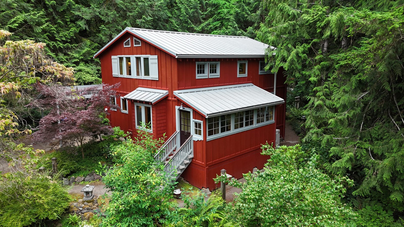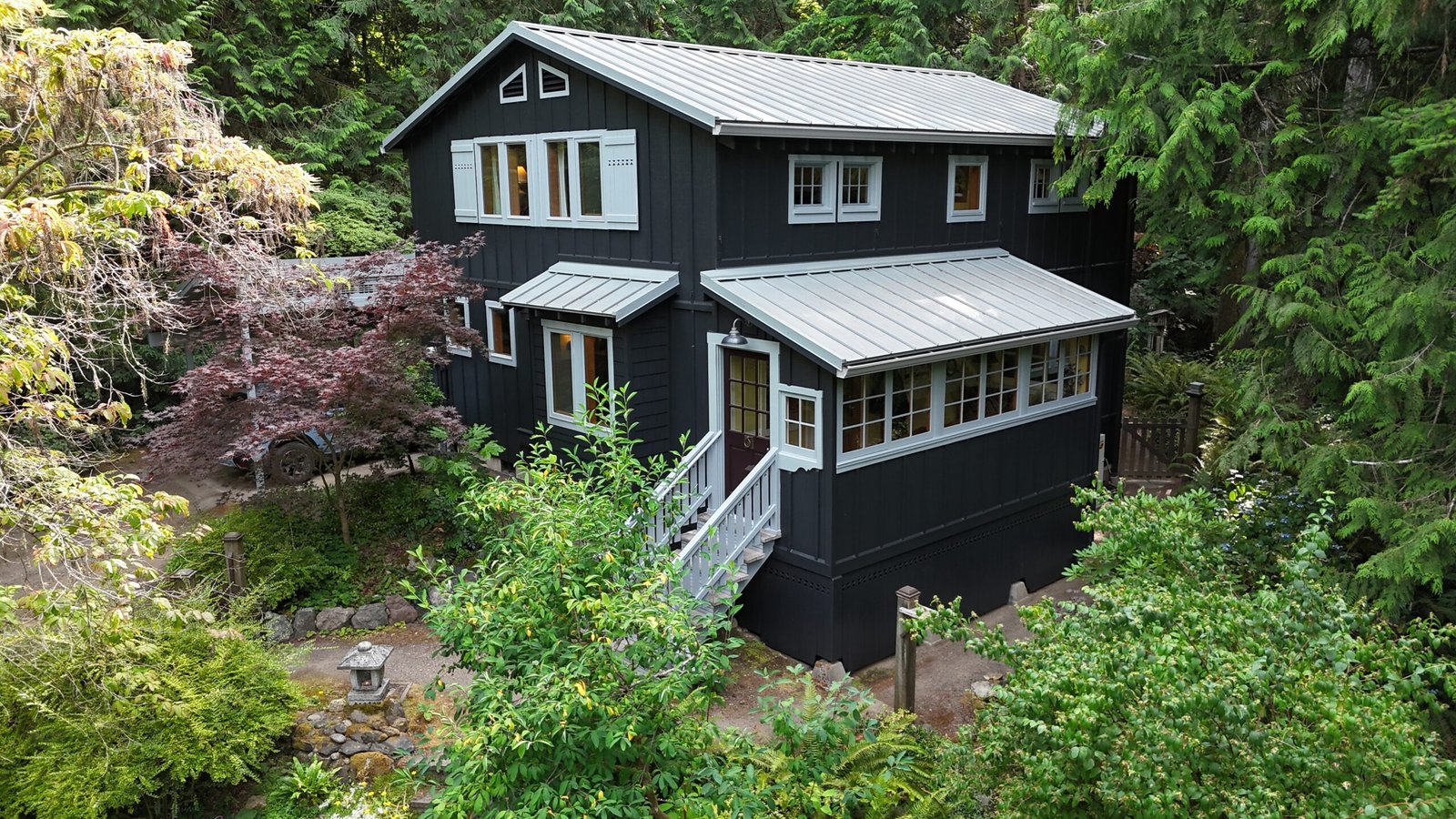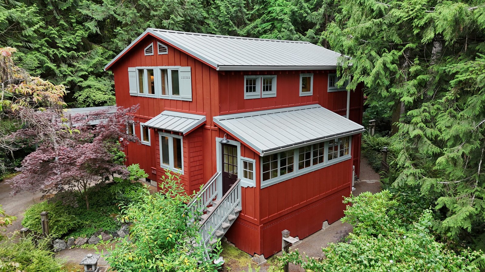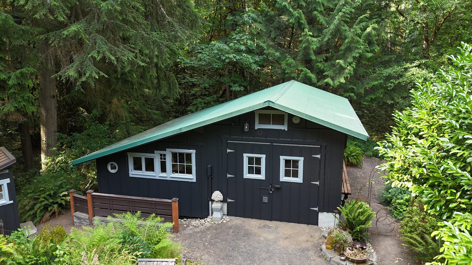 This Bainbridge Island home received a dramatic exterior transformation with a full repaint of both the main house and its separate shed-style building. The original barn-red body with white trim was updated to a striking pure black exterior paired with light gray trim, creating a clean, modern look that blends beautifully with the surrounding Pacific Northwest landscape. The new color scheme modernizes the entire property and gives it a bold, timeless presence. This was a truly beautiful project, and the deep black finish delivers a contemporary style that’s here to stay.